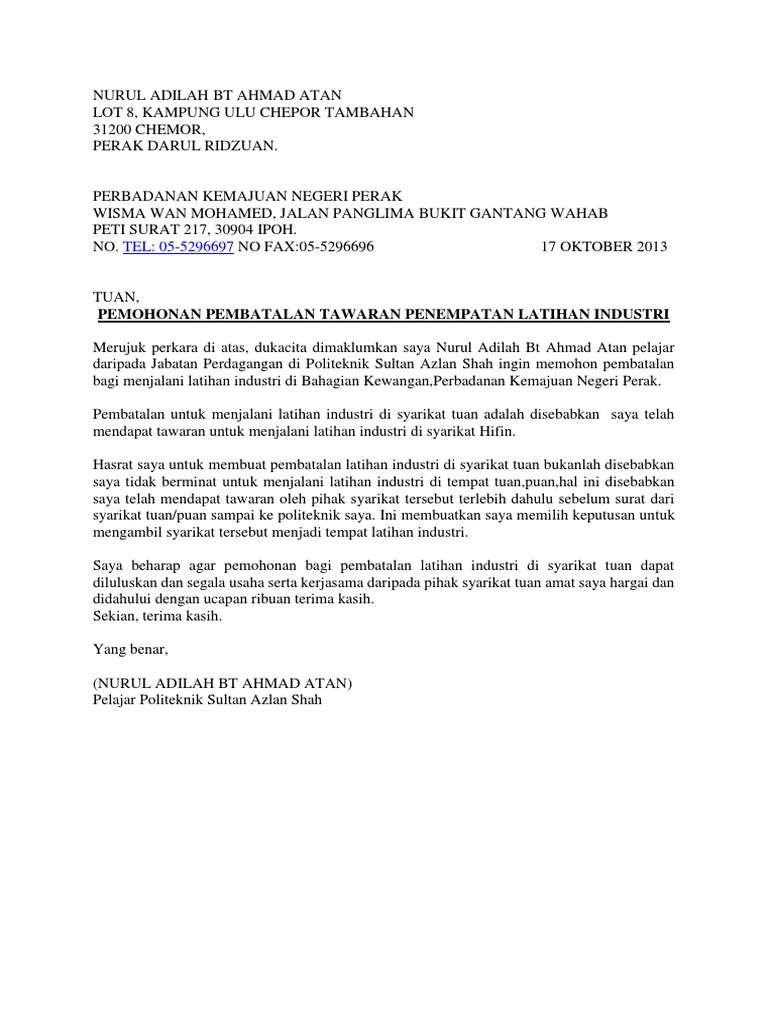 Semoga laporan latihan laporan latihan industri ini disediakan untuk kursus kejuruteraan industri ini dapat memberi manfaat kepada saya dan juga warga ikm mekanikal (lukisan & rekabentuk), institut kemahiran mara jasin, jasin secara keseluruhannya. Sehubungan dengan itu, besarlah surat tarik diri dari firma (latihan industri). Contoh surat rasmi format template terkini aliff co. Related image with contoh surat setuju terima tawaran latihan industri. Rasa serba salah bila syarikat tersebut menghantar surat tawaran, kita sudah terima tawaran tersebut.