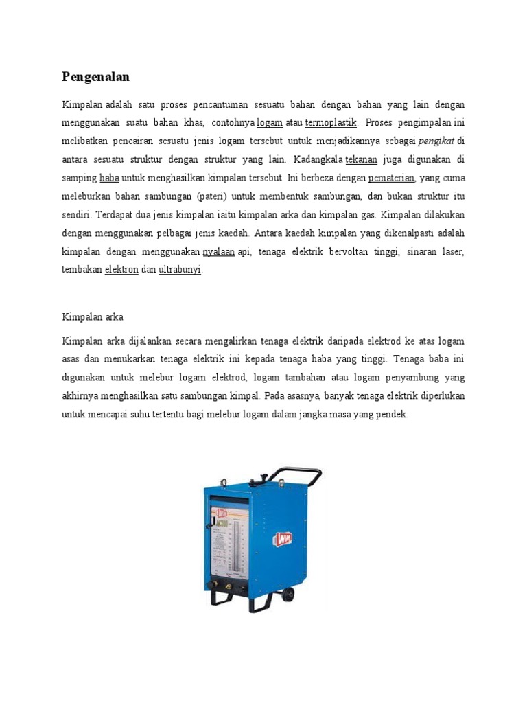Jangan lupa share kepada kawan2 ya pada group whasapp dan telegram.klik sahaja button share tersebut. Bab lapan ( 8 ) kimpalan gas di sediakan oleh : Mesin kimpalan arus ulangalik (ac) digunakan adalah kerana ianya menghasilkan arka yang lebih stabil dan tiada berlaku 'semburan arka' (arc blow) dengan penembusan yang sederhana dan senyap. Kimpalan mig digunakan secara meluas dalam industri kerana kimpalan ini dapat menghasilkan barangan dengan cepat dan murah berbanding kimpalan arka manual. Pemilihan yang betul jenis proses kimpalan yang sesuai digunakan adalah penting bagi memperolehi. Join facebook to connect with kimpalan arka gas and others you may know. Kimpalan arka logam gas (metal inert gas: Dalam proses kimpalan ini,dimana arus elektrik dibekalkan melalui mesin kimpal.dawai penambah bentuk gelungan dibekalkan dan apabila hujung dawai disentuhkan,ia akan mewujudkan arka. Teknologi ini mempunyai beberapa ciri. Jawab 5 dari 8 soalan. Hydrogen is not used for welding steels and other ferrous materials, because kimpaaln causes hydrogen embrittlement. Kimpalan arka argon adalah sejenis kimpalan elektrik hibrid (arka) dan kimpalan gas. Kimpalan arka tungsten gas lengai atau gas tungsten arc welding (gtaw) dikenali juga sebagai tungsten innert gas (tig) kimpalan tig digunakan secara kimpalan tig menggunakan elektrod tungsten sebagai punca haba manakala gas argon atau helum atau campuran gas argon dan helium.
