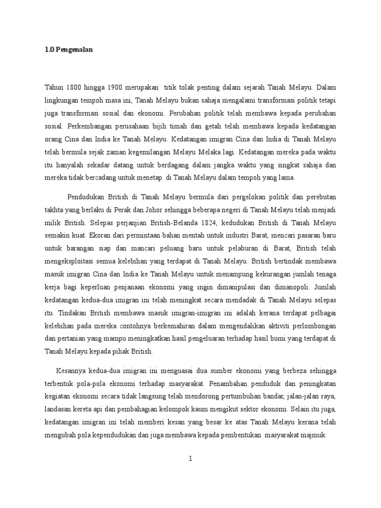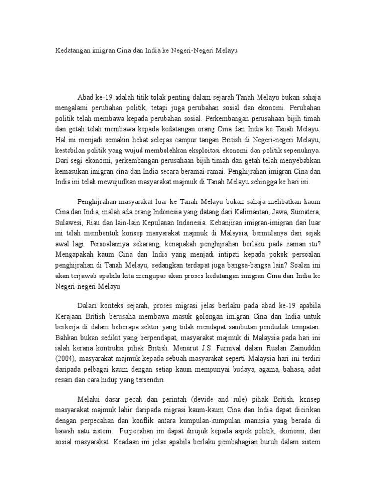 Pdf kedatangan imigran cina ke tanah melayu nur emyra bt mohd salehuddin academia edu. 2 4 jelaskan sebab sebab kedatangan imigran ke tanah melayu serta k. Selain itu,mereka merasakan hidup dinegara ini lebih selamat. Kedatangan golongan ini juga telah mengubah corak dan sistem sosial tanah melayu dan masyarakat melayu pada ketika itu. Imigran china dan india telah lama mengenali tanah melayu sebagai salah satu pusat perdagangan yang penting suatu masa dahulu, ini telah mendorong mereka untuk berhijrah ke tanah melayu. 3m f1 sistem buruh bebas/merdeka. Pada peringkat awal, kemasukan orang india ke tanah melayu dikendalikan melalui satu sistem yang dikenali sebagai sistem buruh kontrak yang mula diperkenalkan pada tahun l820. Ekonomi tanah melayu ketika zaman kolonial bersifat majmuk. Kewujudan kaum imigran ini bukan sahaja mengubah wajah masyarakat tanah melayu tetapi juga telah menyumbang kepada banyak aspek sosial dan ekonomi. Masyarakat imigran (cina dan india) datang ke tanah melayu. Cara kemasukan imigran cina dan india ke tanah melayu for more information and source, see on this link : · wujud hubungan tradisi antara kerajaan india dengan tanah melayu. Berikan 2 contoh kesan sosial kemasukan imigran cina dan india ke tanah melayu.