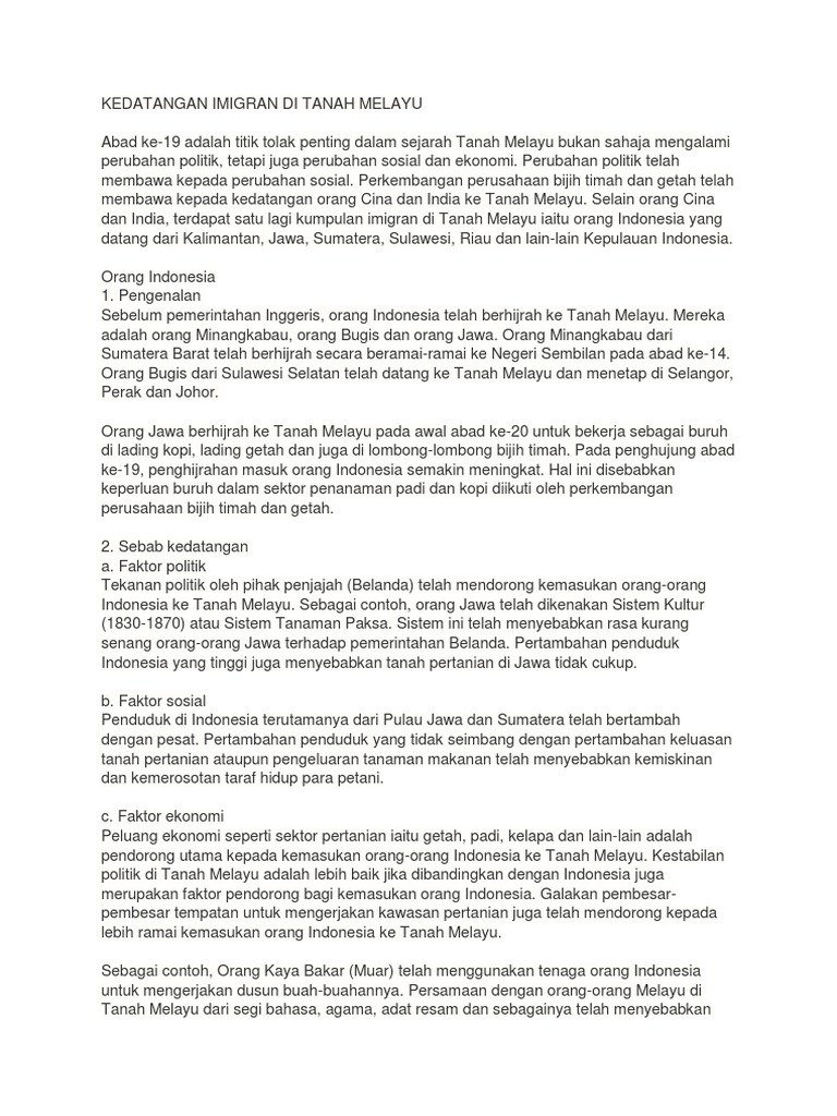 2 4 jelaskan sebab sebab kedatangan imigran ke tanah melayu serta k. Imigran china dan india telah lama mengenali tanah melayu sebagai salah satu pusat perdagangan yang penting suatu masa dahulu, ini telah mendorong mereka untuk berhijrah ke tanah melayu. Kemasukan para imigran asing membawa satu dimensi baharu dalam proses pembentukan masyarakat majmuk di malaysia (ruslan zainuddin, 2005:41). This set is often in folders with. Kerajaan british telah membawa masuk buruh daripada cina dan india ke tanah melayu untuk bekerja di sektor perlombongan dan perladangan.